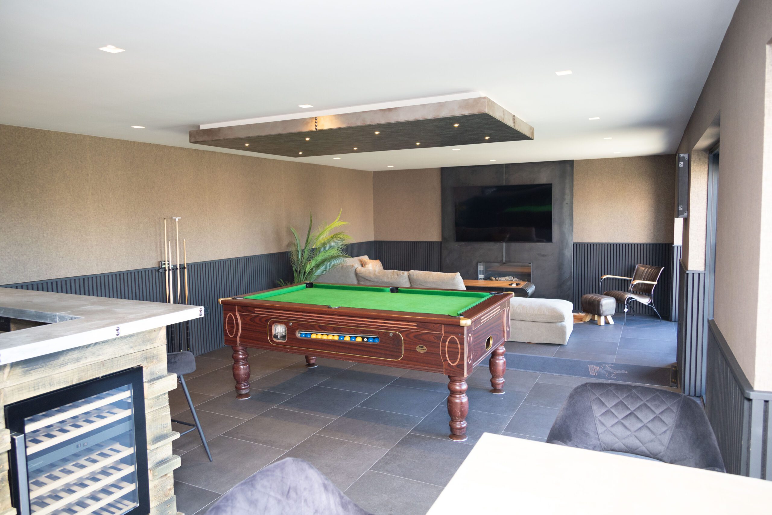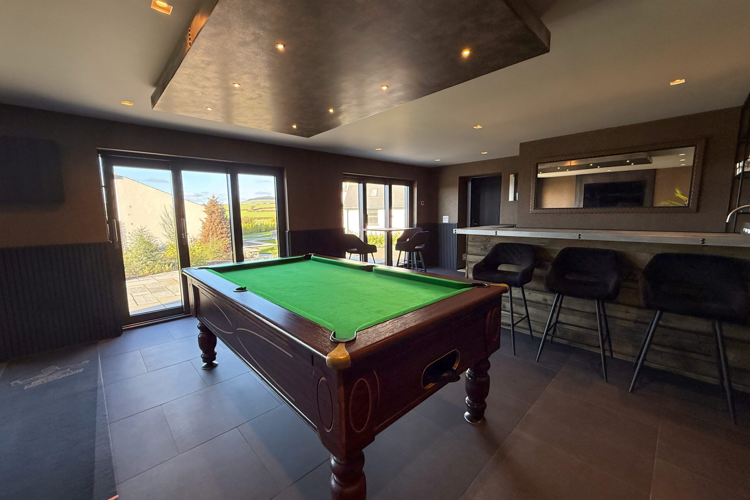 Step outside and immerse yourself in the stunning surroundings. Unwind in the outdoor hot tub, perfectly positioned to take in expansive views across the southern countryside. For those seeking entertainment, the private games room – complete with a bar, pool table, and TV – provides the ideal space to gather and enjoy.